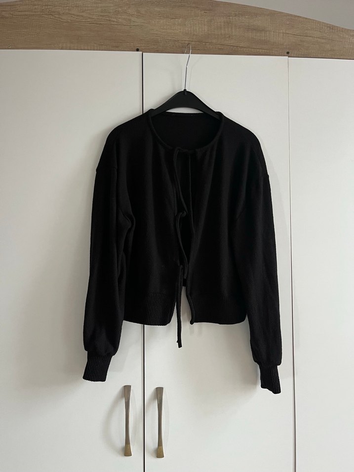 Siyah mini hırka, uzun kollu ve yuvarlak yakalıdır. Yumuşak ve sıcak kumaştan üretilmiş, rahat kesimiyle günlük şıklık sağlar.