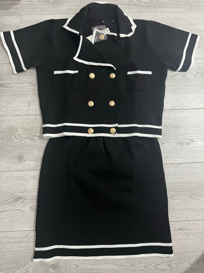 Siyah mini kadın takımı, kısa kollu, düğmeli ve beyaz şerit detaylıdır. Ofis için şık ve trend görünüme uygundur.