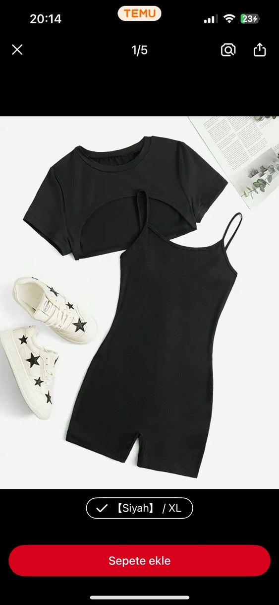 Siyah mini tulum, askılı ve straplez kesimle, kısa kollu crop top ile birlikte, yumuşak sentetik kumaştan günlük şık bir görünüm sunar. ✨