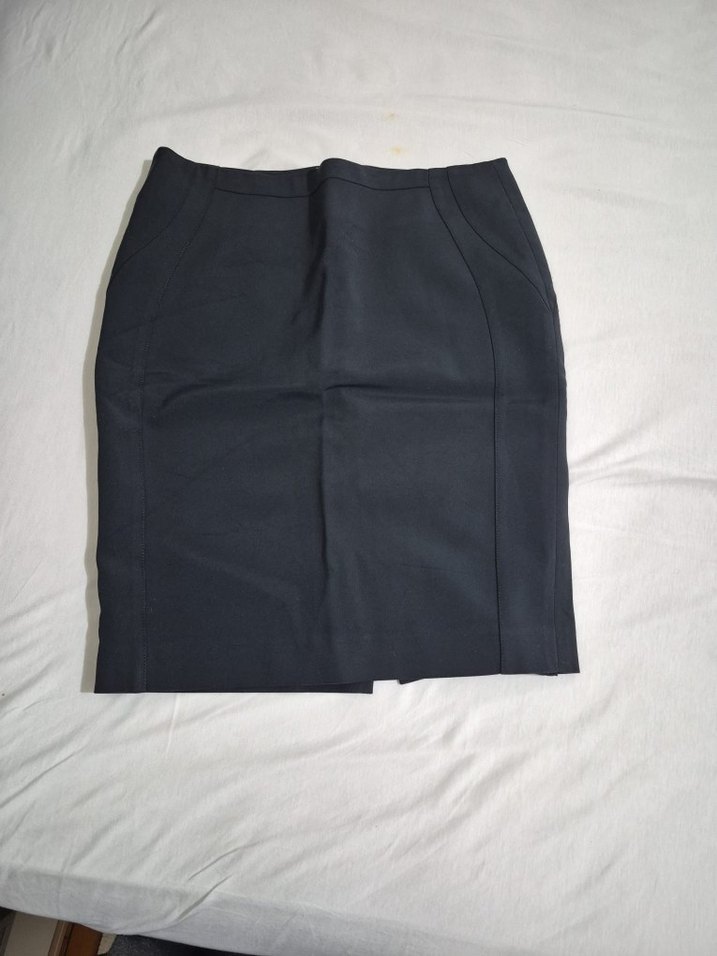 Siyah mini kalem etek, düz tasarımı ve rahat kesimi ile iş ortamları için uygun, pürüzsüz sentetik kumaştan üretilmiştir.