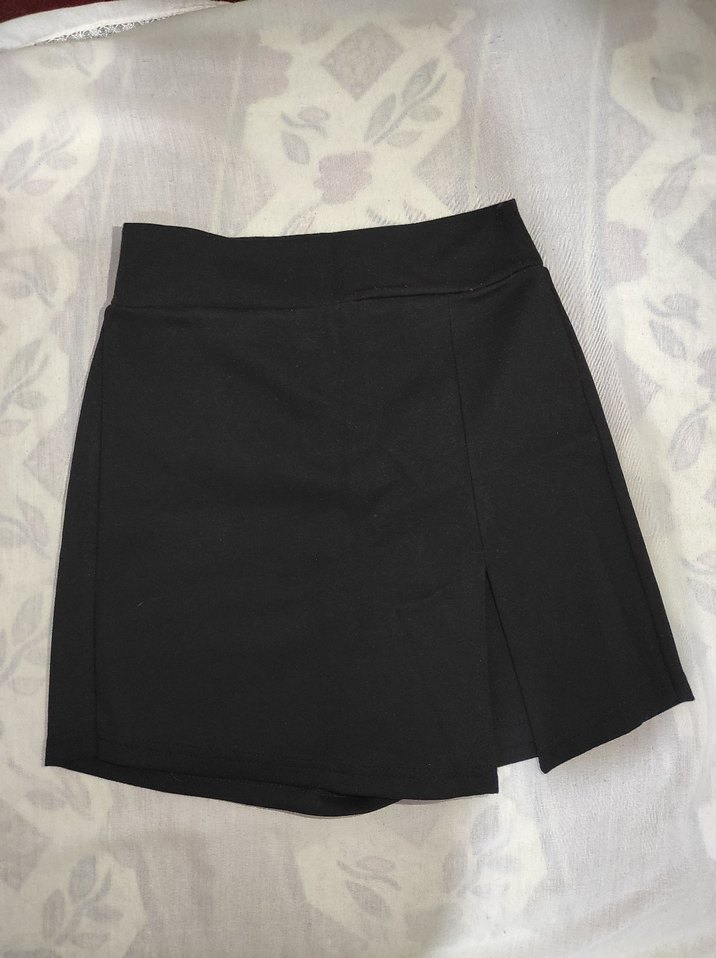 Siyah mini kalem etek, ön kısmında küçük yırtmaç ve günlük kullanım için uygun, pürüzsüz sentetik kumaştan yapılmıştır. Bir kere giyildi defosu yok bir sorunu yok tertemiz