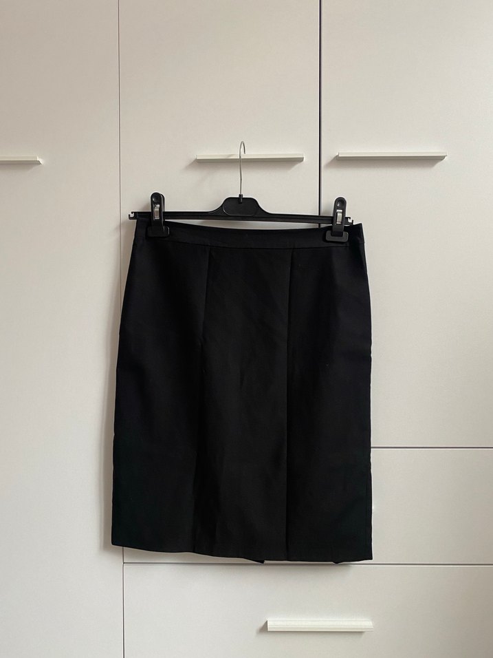 Siyah mini kalem etek, ipeksi dokusu ve rahat kesimiyle ofis için şık goth tarzını yansıtıyor.