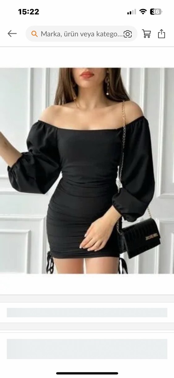 Siyah mini elbise, kayık yaka ve balon uzun kollara sahiptir. Bel detaylı ve sentetik kumaştan üretilmiştir. Romantik akşamlar için uygundur.✨
