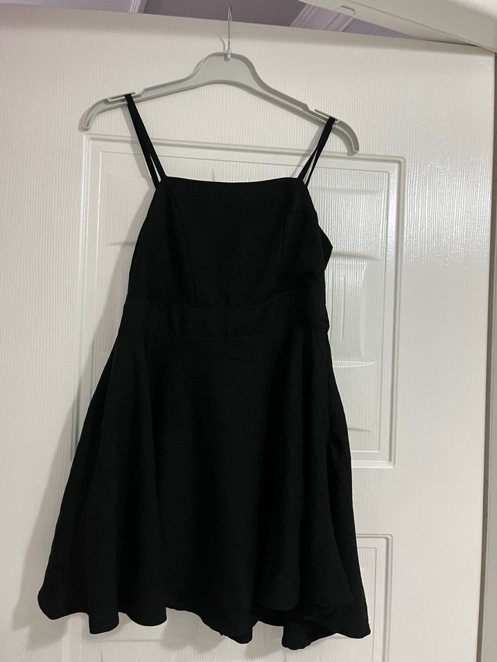 Siyah mini keten tulum, V yakalı ve askılı kollu, vücuda oturan kesime sahiptir. Fermuarı kolay kullanım sağlar. Günlük ve sokak stili için uygundur.