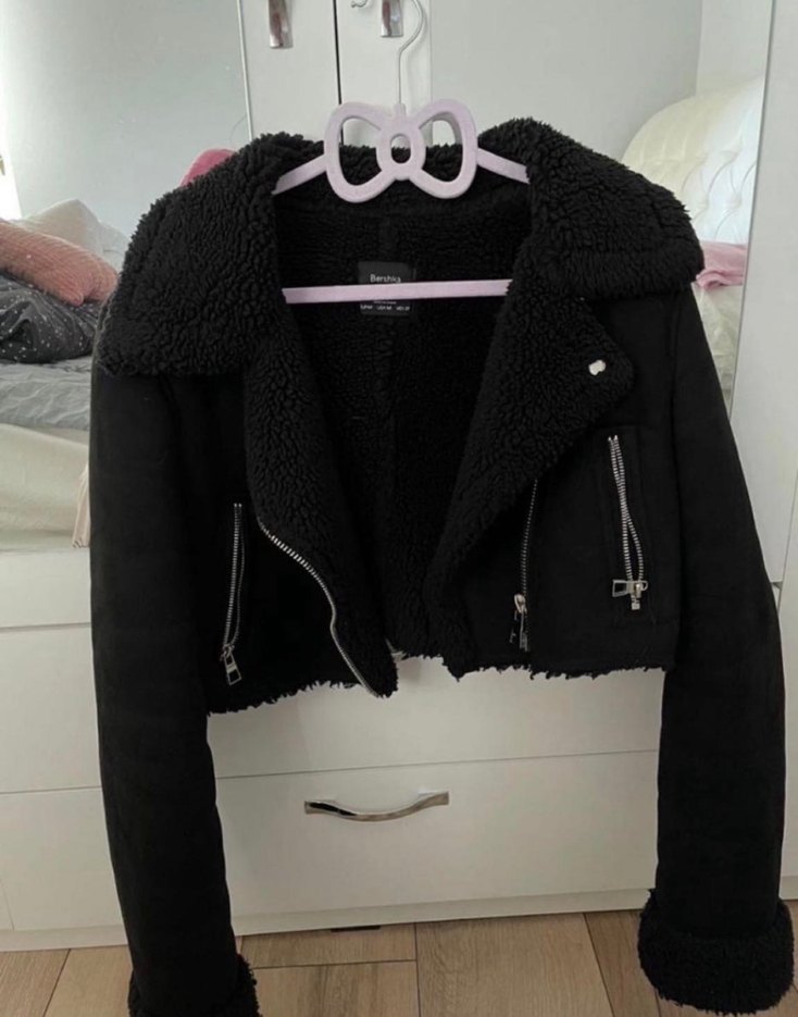 Siyah mini kısa ceket, kürklü detaylı yakası ve askılı kollarıyla rahat ve şık bir görünüm sunar. Günlük kullanıma uygundur.