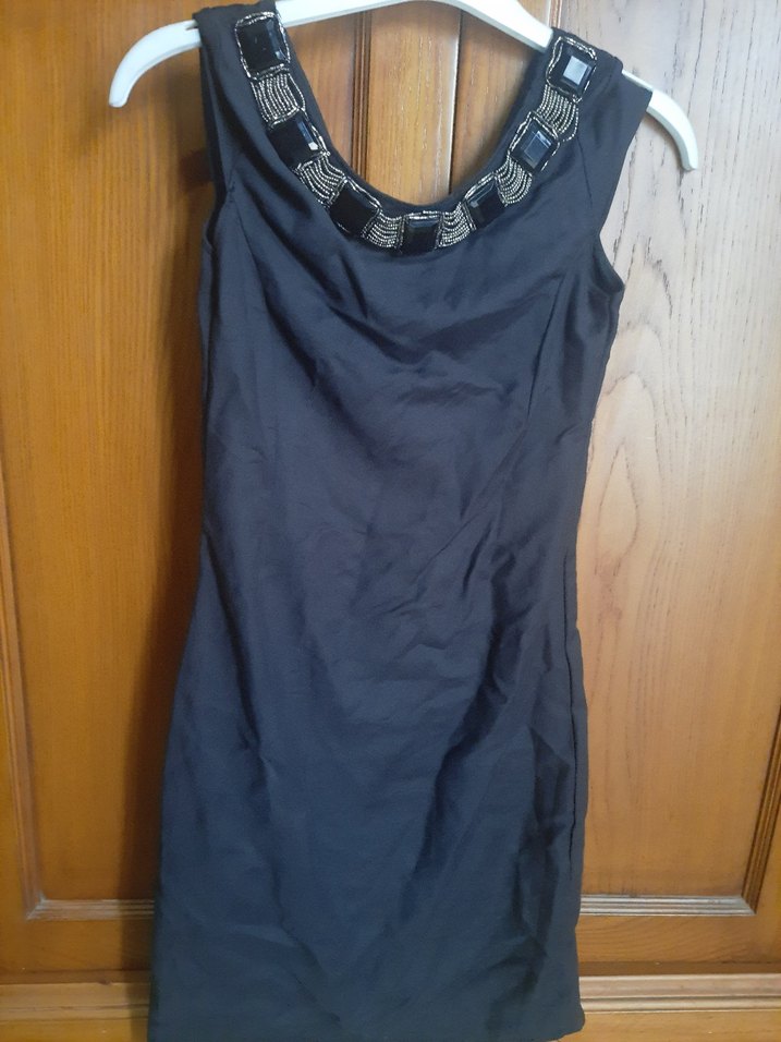 Kolsuz, vücuda oturan siyah mini dekoratif detaylı elbise.