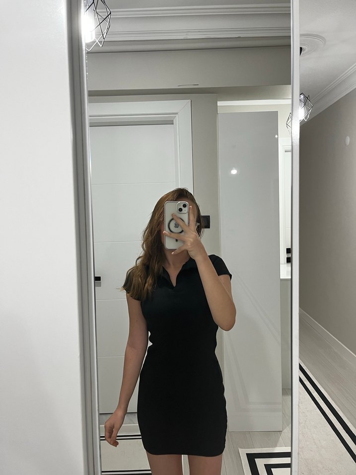 Siyah, mini kollu ve yakalı, vücuda oturan midi elbise. İpeksi kumaştan, minimalist gotik tarzıyla günlük şıklık sunar.