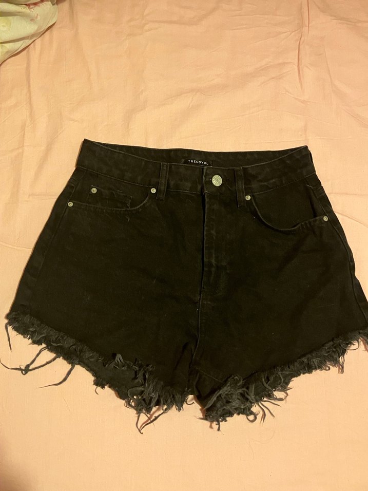 Siyah renkli, bol kesim kot şort, yırtık ve püsküllü kenarlarıyla rahat ve şık bir görünüm sunar. Günlük sokak stili için uygundur.