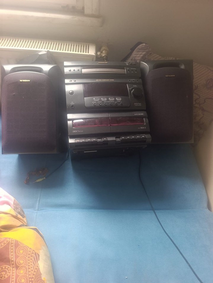 İki hoparlörlü siyah mini müzik sistemi, CD ve radyo çalma özellikli.