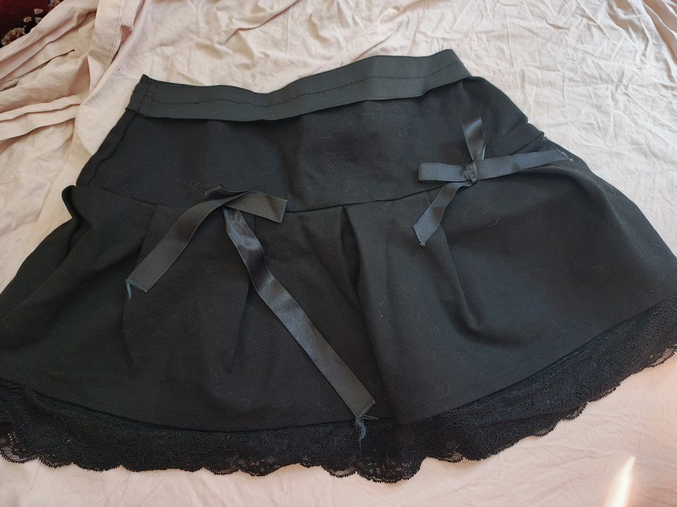 Siyah, dantel ve kurdaleli ve ince esnek kumaştan yapılmış, ribon detaylı, dantel uçlu, oturan mini etek.