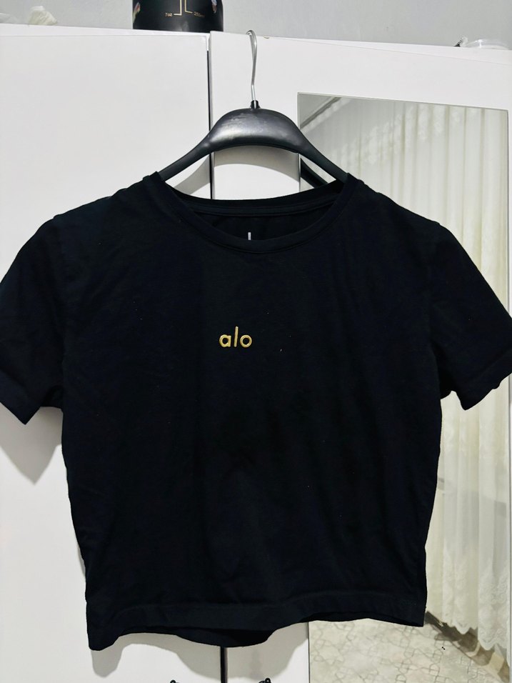 Siyah mini uzunlukta, kısa kollu, yuvarlak yakalı ve oversize kesime sahip kadın tişörtü. Yumuşak pamuktan üretilmiş, önünde "alo" baskısı bulunur.