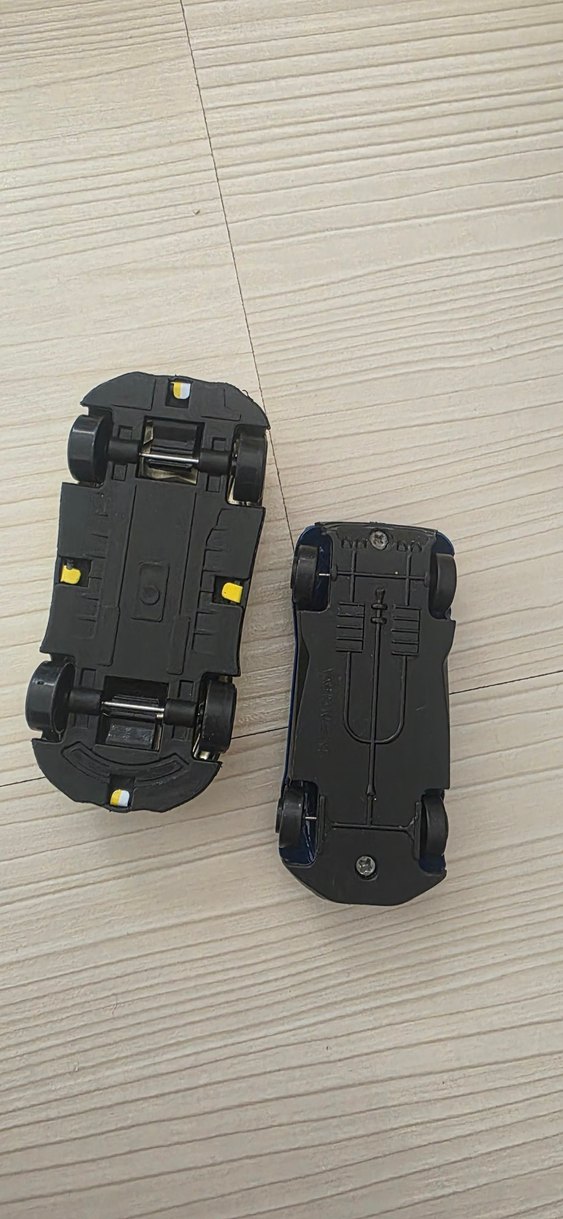 İki siyah oyuncak araba, ayrıntılı alt kısımları ve hareketli tekerlekleriyle oyun ve koleksiyon için uygundur.