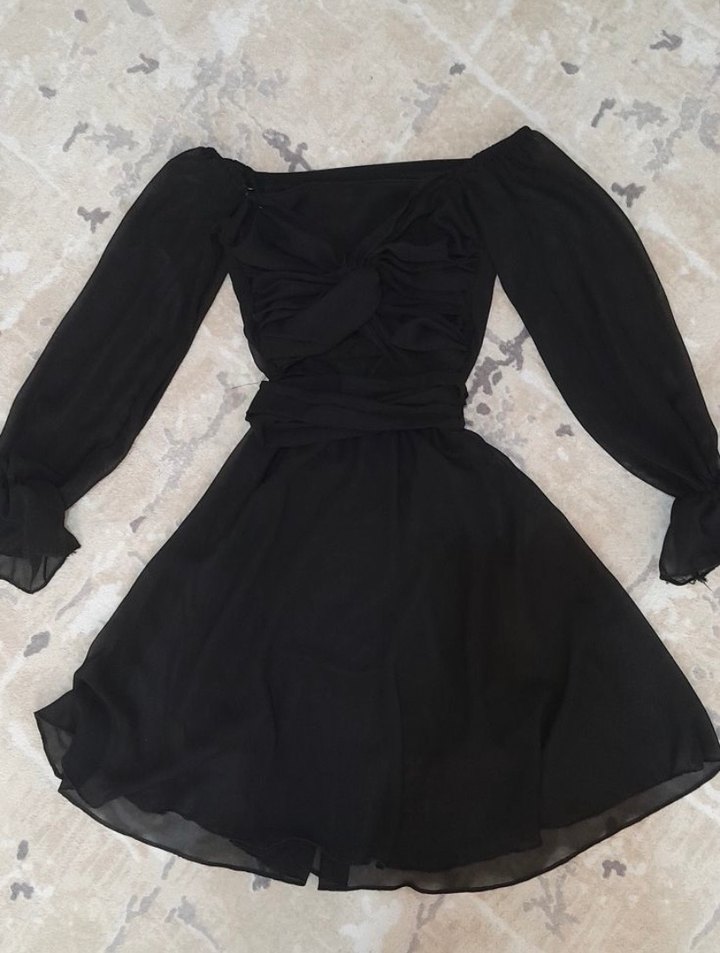 Siyah mini gece elbisesi, drapeli tasarım, bol kesim ve uzun şeffaf kollara sahiptir. Romantik buluşmalar için uygun. Bedeni xs güzel görünüme sahip.