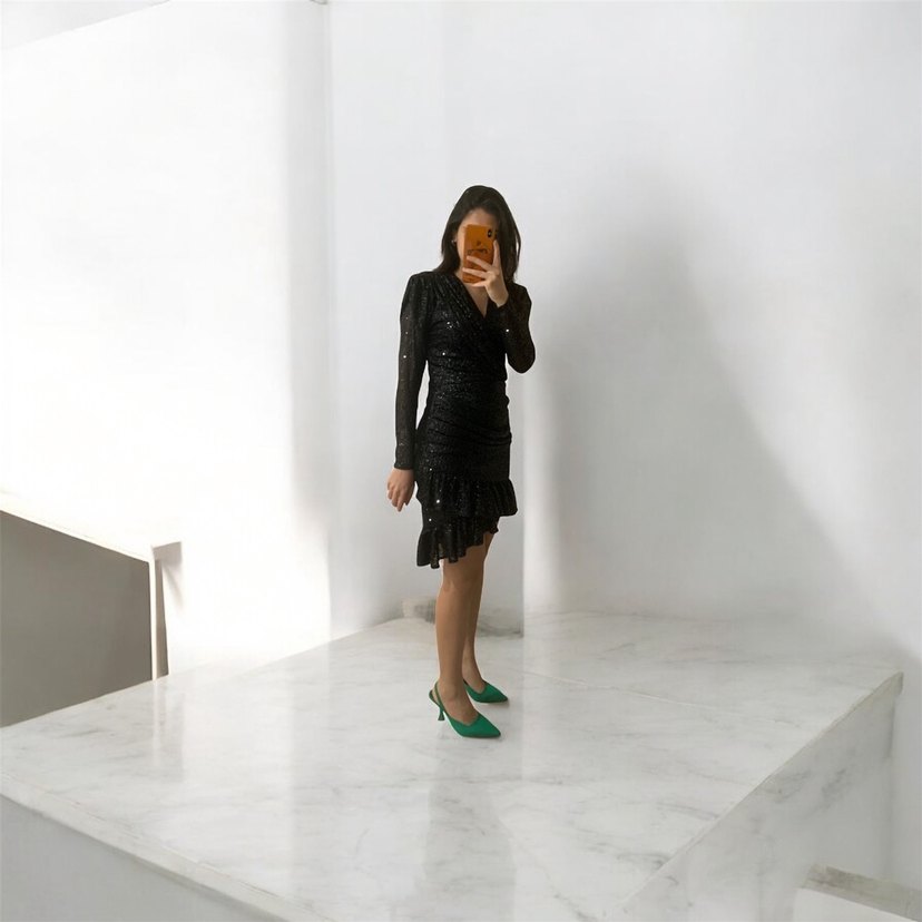 Siyah Mini Payetli Uzun Kollu Elbise