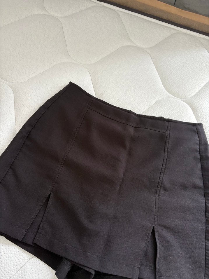 Siyah mini etek, pilili ve vücuda oturan kesime sahip. Düz sentetik kumaştan, minimalist sokak stiline uygun, günlük kullanım için ideal.