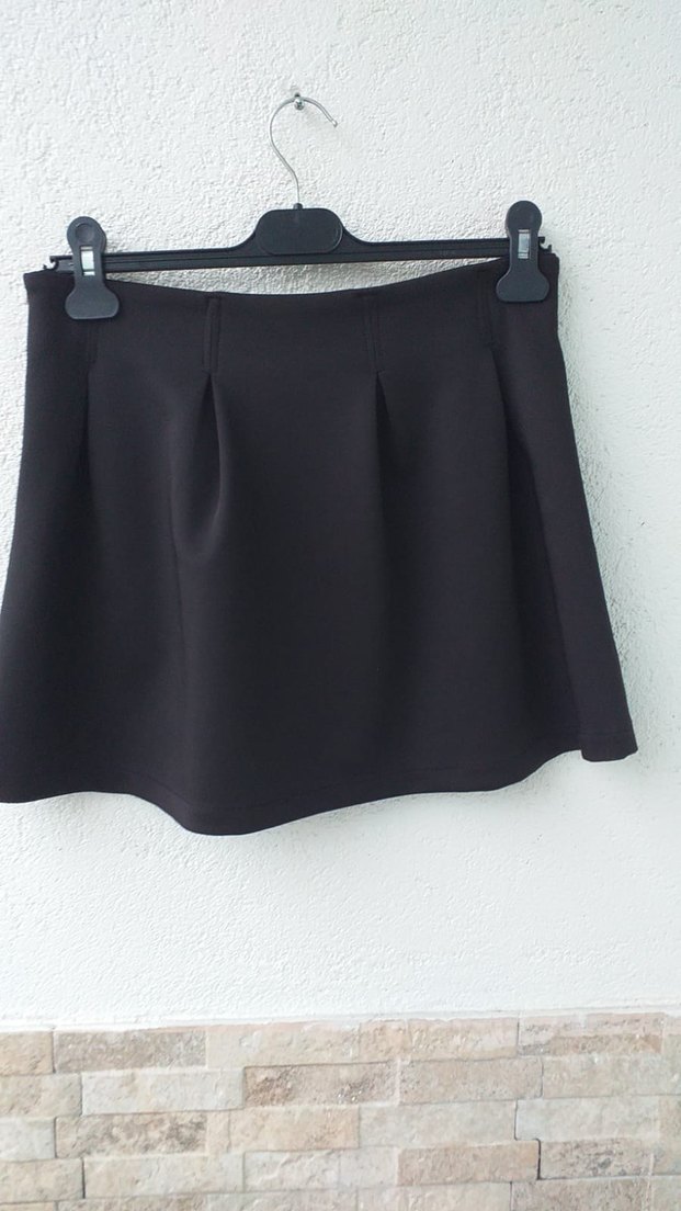 Siyah, pilili detaylara sahip, sentetik kumaştan üretilmiş, bol kesimli mini etek. Günlük sokak stili için sade ve minimal.