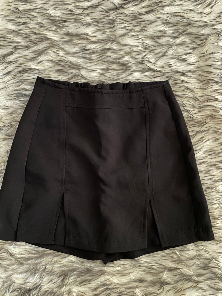 Siyah renkli, pilili ve saten dokulu, vücuda oturan mini etek. Minimalist gotik tarzıyla günlük kullanıma uygundur.
