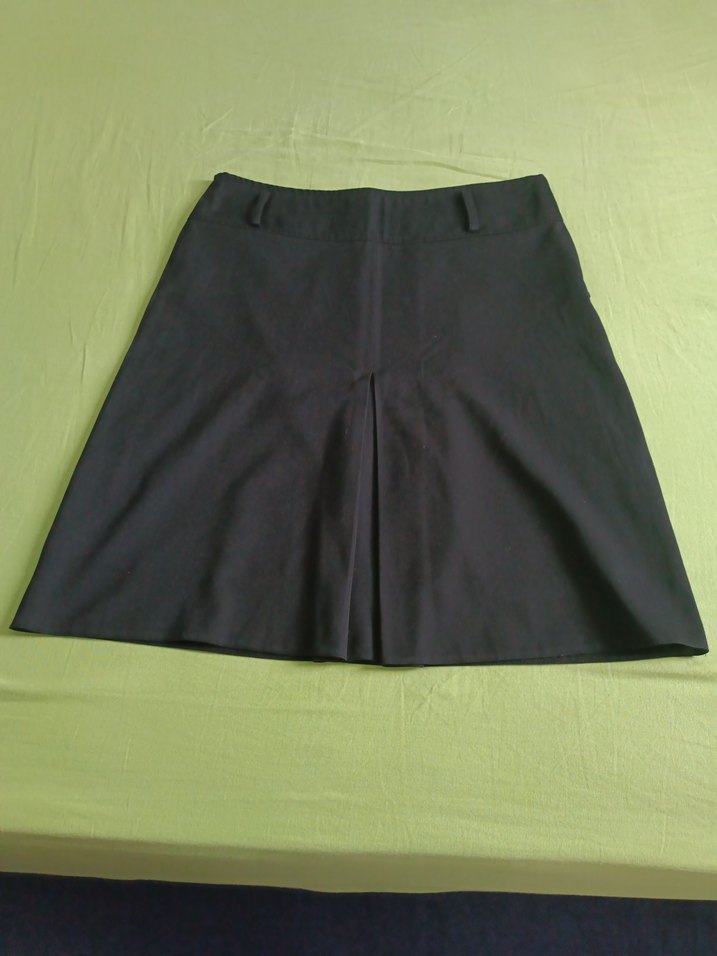 Siyah mini boy piliseli ve bol kesim, ipeksi dokuda, ofis kullanımı için uygundur.