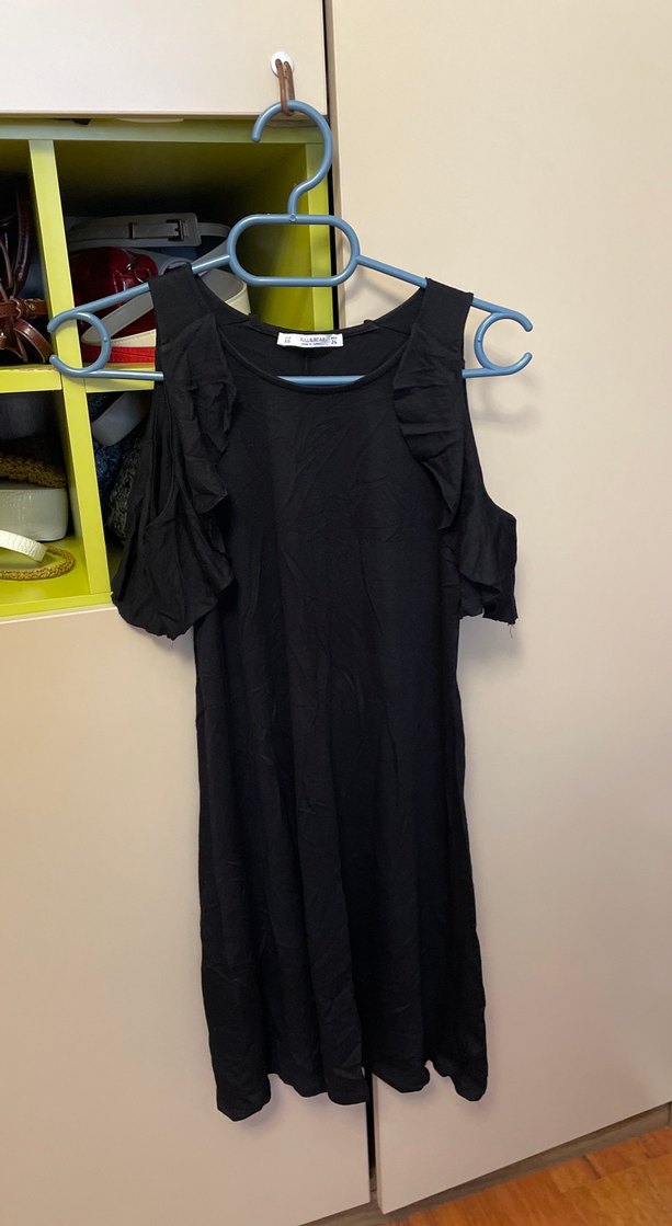Siyah mini elbise, rahat kesim ve kısa kollu. Volan detayları ve düz tasarımıyla günlük kullanıma uygundur.