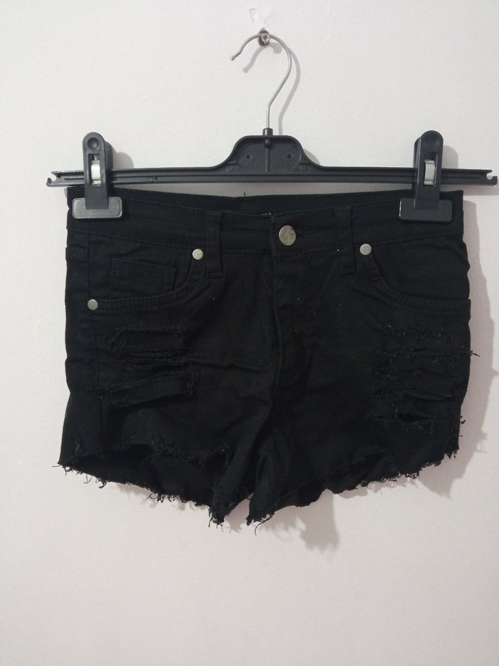 Koyu siyah renkli, tokalı ve yırtık detaylı, dar kesim mini denim şort. Rock punk tarzı için uygun, dış mekan kullanımı için ideal.