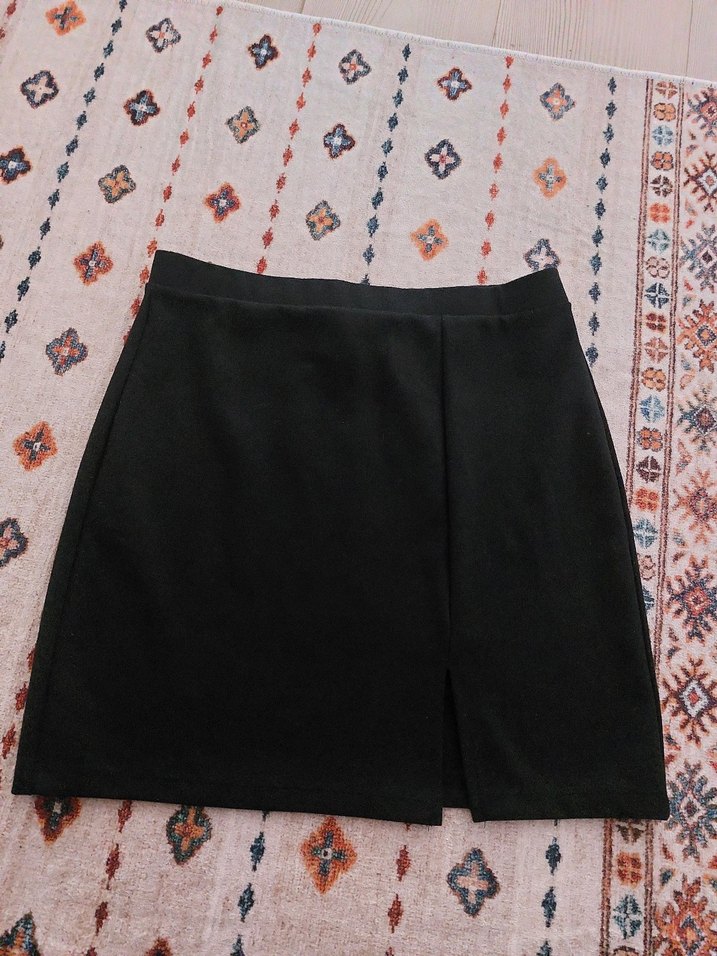 Siyah mini etek, dar kesim ve sade tasarıma sahip. Pürüzsüz sentetik kumaştan üretilmiş, günlük kullanım için zahmetsiz şıklık sunar.
