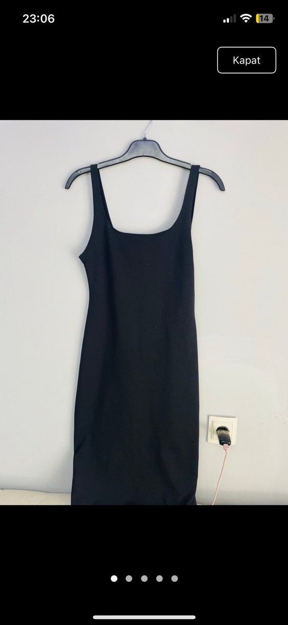 Bu dar kesim siyah mini elbise, kolsuz ve kare yakalıdır. Pürüzsüz sentetik kumaştan üretilmiş olup günlük sokak stili için zahmetsiz şıklık sunar.