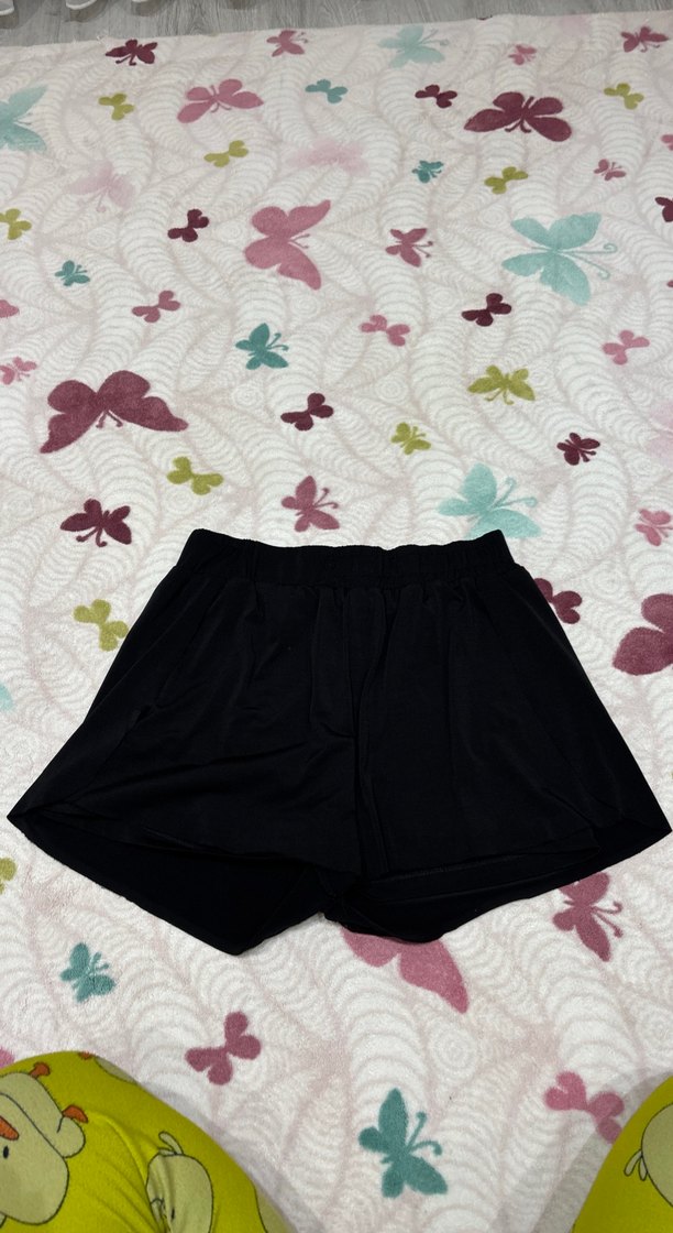 Saten kumaştan, bol kesim siyah mini şort, sokak stili ve zahmetsiz şıklık için, romantik buluşmalar için uygundur.