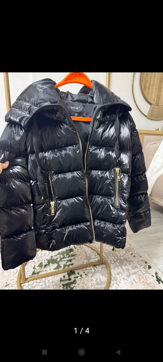 Yüksek yakalı, fermuarlı cepli siyah mini mont, yumuşak sentetik kumaştan, rahat sokak tarzı için uygundur. Günlük kullanıma ideal.