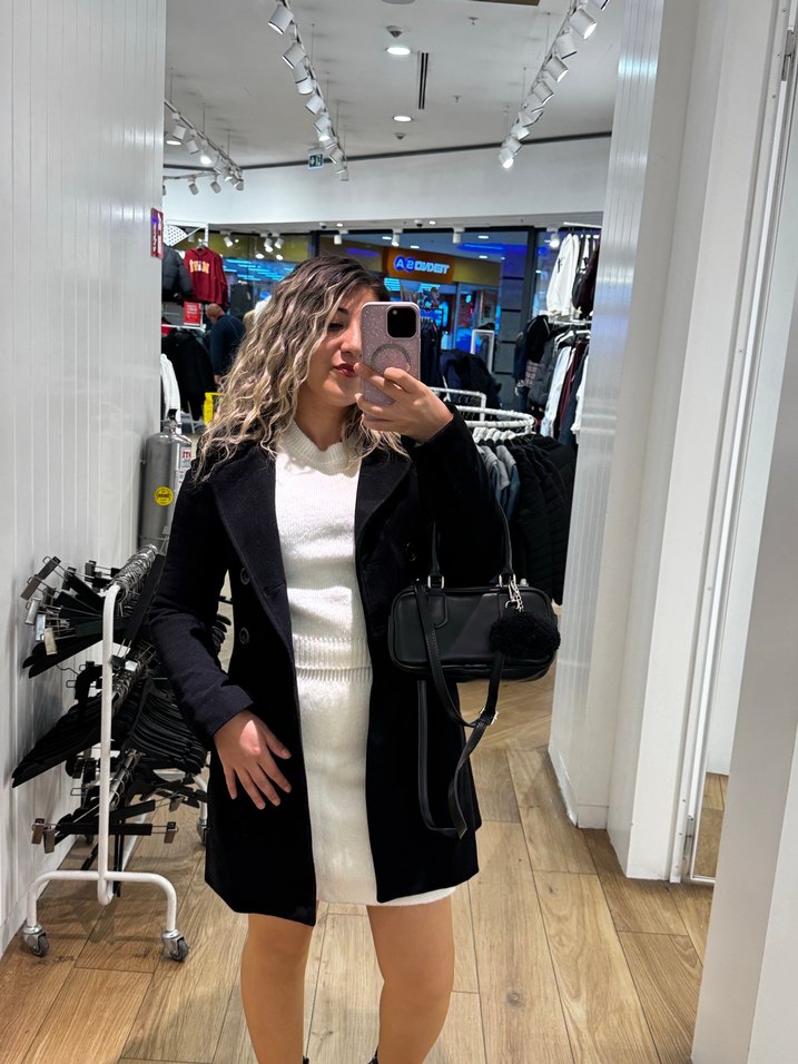 Siyah mini kaban, kesik yaka ve uzun kollu,günlük sokak stiline şık dokunuş.