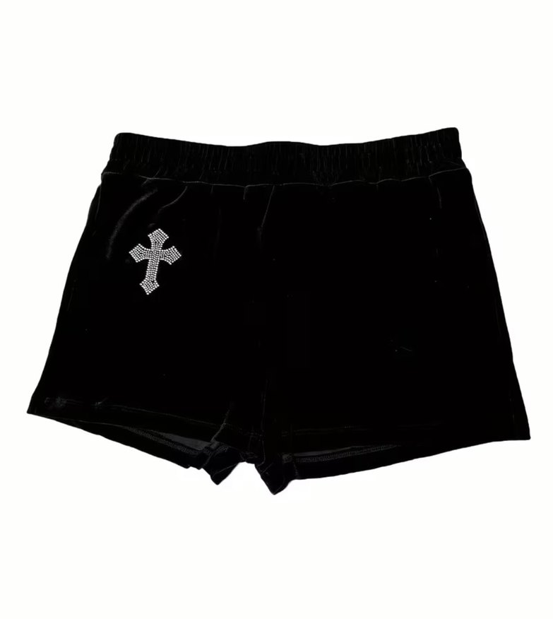 Siyah kadife malzemeden yapılmış, gotik haç detaylı, rock punk havası taşıyan fit kesim mini şort.