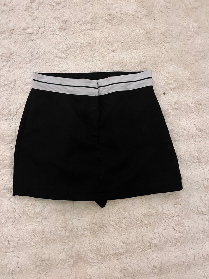 Kemer detaylı, siyah mini şortlar, yumuşak sentetik kumaştan üretilmiş olup sokak modası ve açık hava etkinlikleri için uygundur.