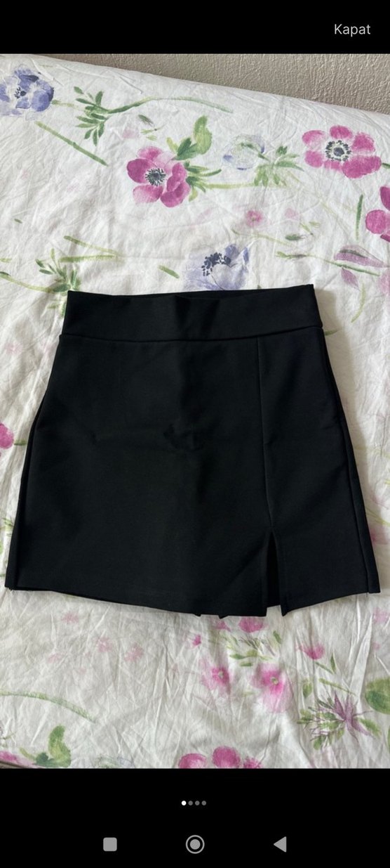 Siyah mini etek, dar kesim ve önünde küçük yırtmaç ile sade ve şık bir görünüm sunar. Pürüzsüz sentetik kumaştan, günlük kullanıma uygun. M-l beden