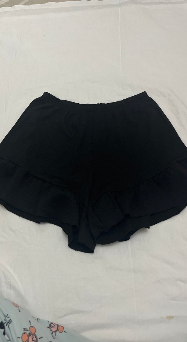 Siyah, rahat kesim mini şort, fırfır detaylı ve ipeksi kumaştan. Minimalist goth tarzı ve romantik buluşmalar için uygun.