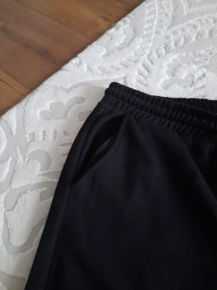 Siyah renkli, sentetik kumaştan mini uzunlukta ve bol kesim erkek eşofman altı. Fermuarlı cepleri ve lastikli beli ile spor ve rahat sokak stiline uygun.