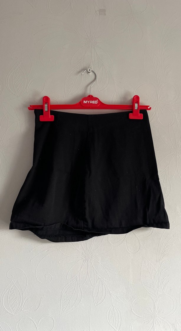 Düz siyah mini etek, sıkı kesimi ve sentetik kumaşıyla spor ve gotik tarzı bir araya getirir.