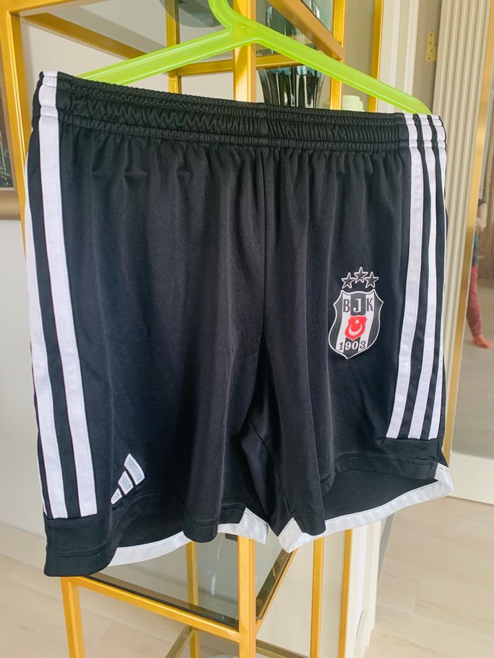 Siyah renkli, baskılı detaylara sahip, kemerli ve vücuda oturan mini spor şort. Sentetik kumaştan üretilmiştir. Orjinal Beşiktaş şortu gayet iyi durumda