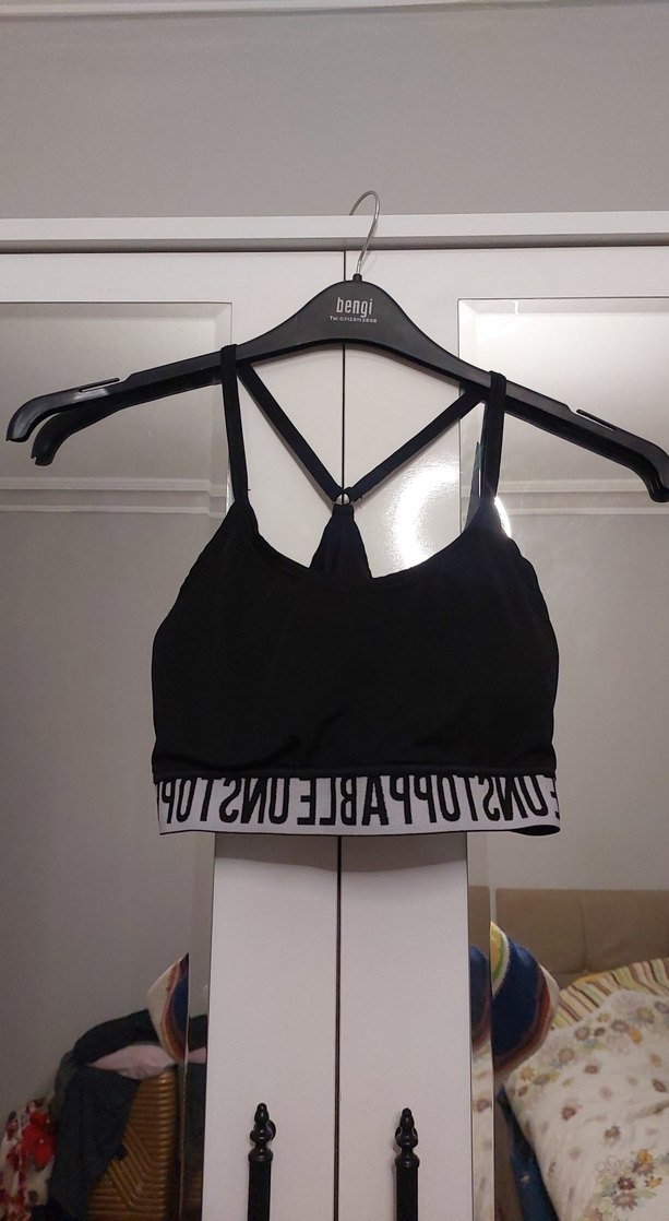 Siyah mini spor sütyeni, kısa boy ve sade tasarıma sahiptir. İnce askıları ve özel sırt detayı ile konforlu elastik bant bulunur.