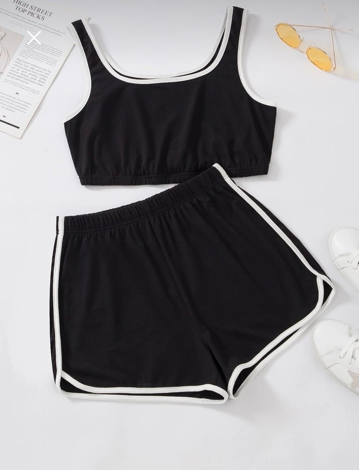 Siyah, beyaz şerit detaylı, straplez ince askılı mini spor takımı. Kadınlar için rahat ve şık sentetik kumaştan.
