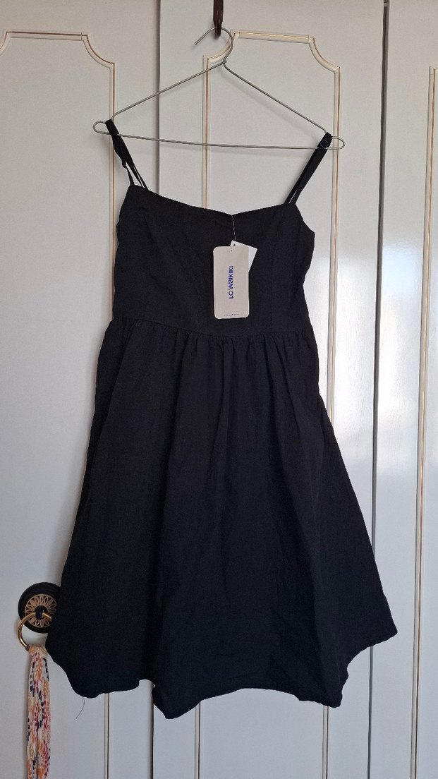 Siyah mini ve askılı elbise, bol kesim elbise giç kullanılmadı.