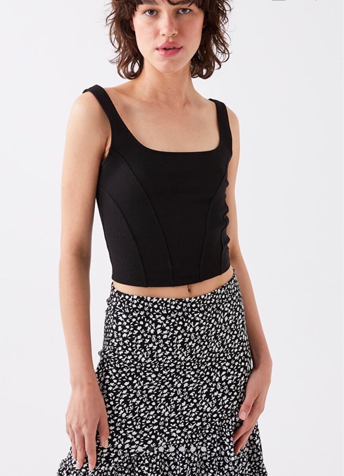 Siyah, straplez yakalı ve vücuda oturan mini büstiyer, yumuşak sentetik kumaştan üretilmiştir. Günlük kullanıma uygun minimal sokak stiliyle uyumludur.