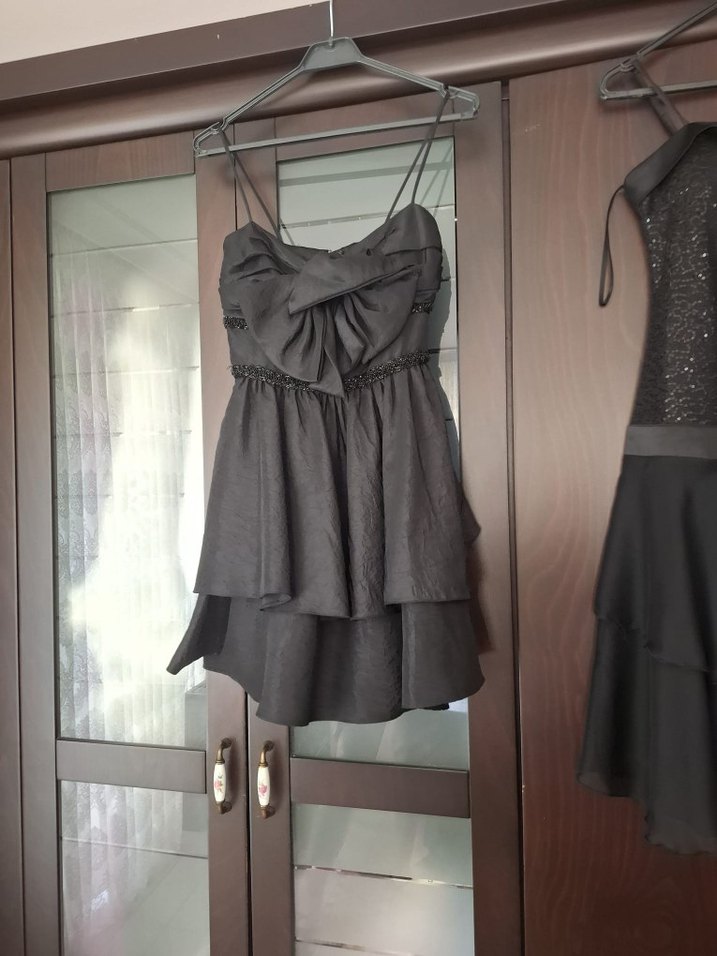 Siyah mini gece elbisesi, ince askılı straplez yaka ve fırfır detaylarına sahiptir. Vücuda oturan kesimi ve kat kat etek kısmı ile gotik tarz partiler için uygundur.