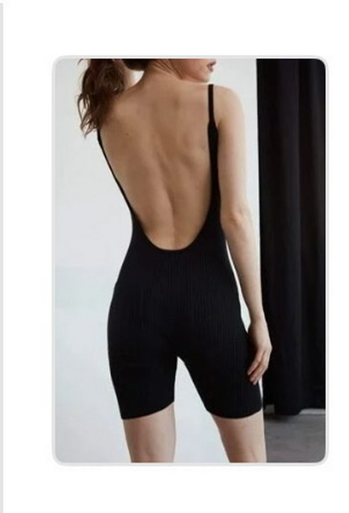 Siyah kısa tulum, straplez yaka ve ince askılarla tasarlanmıştır. Sıkı kesimi ve sentetik kumaşıyla sportif ve şık bir görünüm sunar. #stradivarius