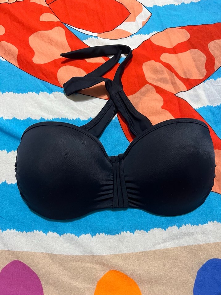 Siyah, kısa ve strappy askılı bu bikini üstü, rahat ve şık bir tarz sunar. Cesur ve athleisure etkili tasarımıyla plajda dikkat çeker.