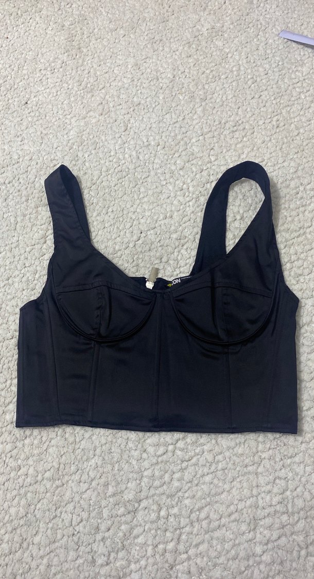 Siyah mini büstiyer, askılı ve straplez yakalı. Sentetik kumaştan, fit kesim ve gotik tarzda, dış mekanlar için uygun. Boy 38 cm
