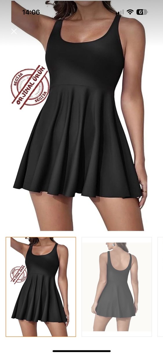 Siyah mini mayo, strappy askılı ve etek detaylı, rahat ve şık bir görünüm sunar, günlük kullanıma uygundur.