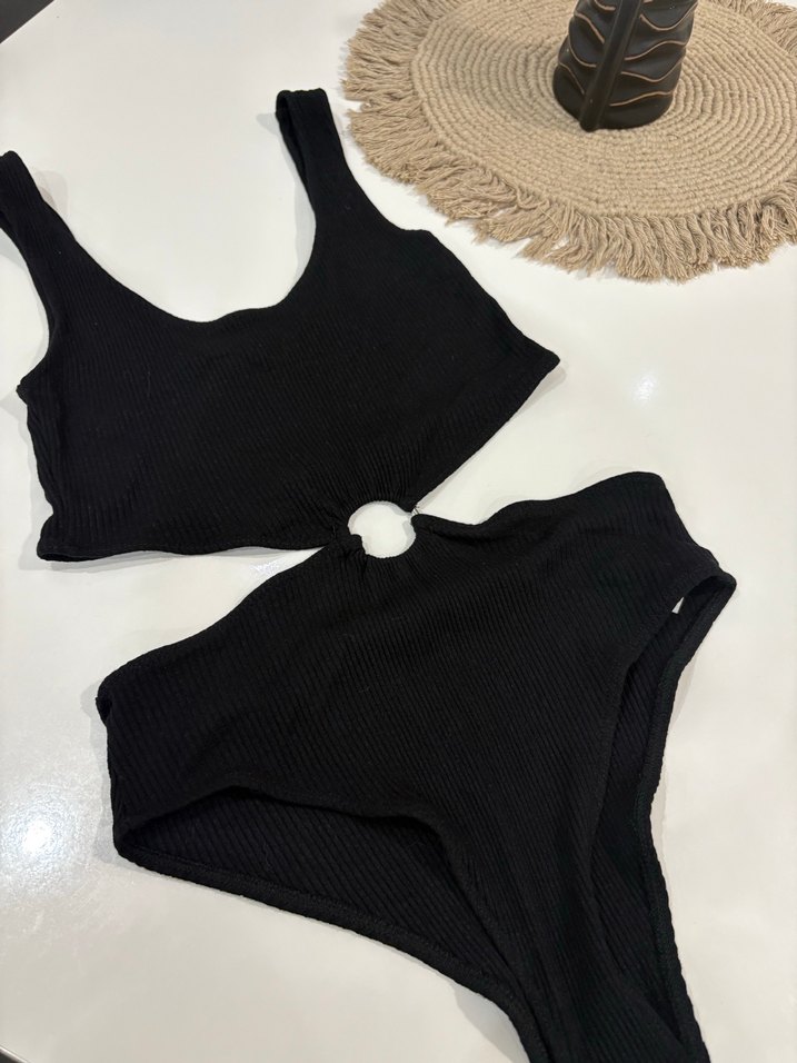 Siyah, kısa kesim, askılı ve belinde halka detayı bulunan kadın body. Minimalist ve şık tasarımıyla dış mekan kullanımı için uygundur.