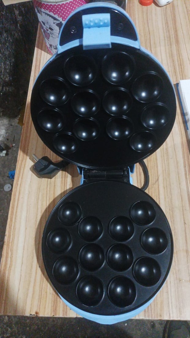 Küçük kek veya sandviç yapmak için çoklu yuvarlak kalıplara sahip siyah mini cihaz. Kompakt tasarım ve kullanımı kolay kablo bulunur.
