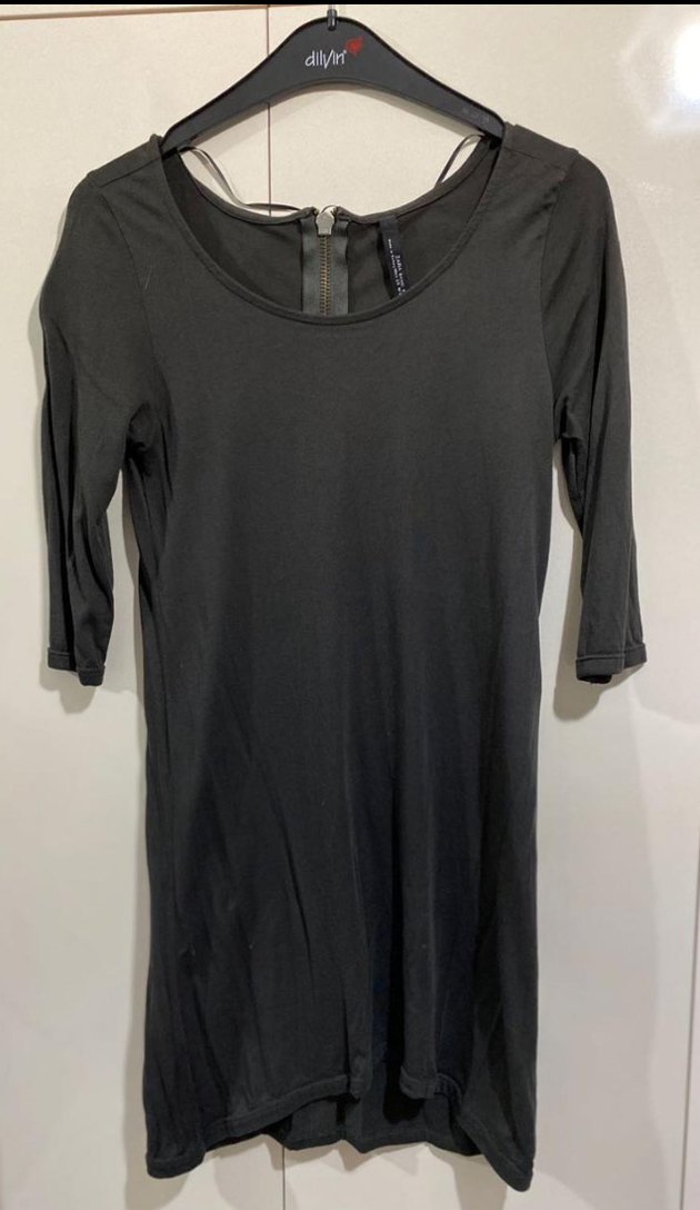 Bermuda kollu, yuvarlak yakalı antrasit mini elbise, vücuda oturan kesimi ve düz tasarımıyla günlük kullanıma uygun minimalist gotik tarzda. Ürün daha önce 2-3 kere giyildi uzun zamandır dolapta duruyor. İster tunik ister elbise. Fermuar kulbu kırık ama açılıp kapanmasında sorun yok.İade yoktur