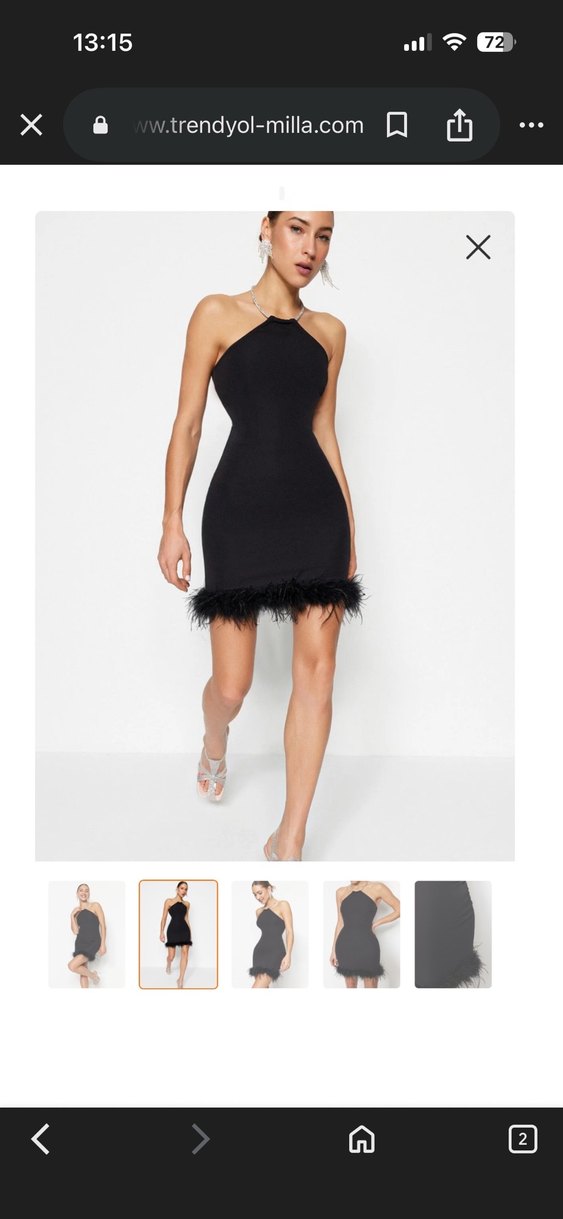 Siyah mini kokteyl elbisesi, straplez yaka ve tüylü detaylı etek ucu ile cesur parti tarzları için uygundur. Bi iki defa kullanıldı hiçbir sıkıntısı yok