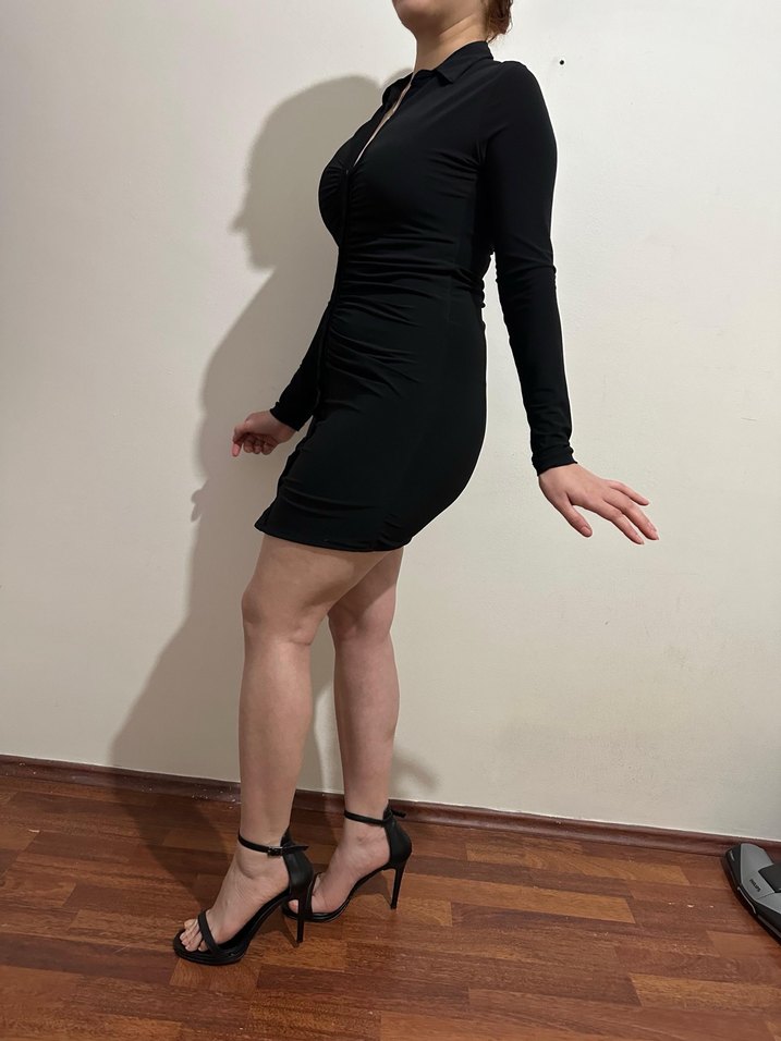 Siyah, dar kesim mini elbise, V yaka ve uzun kollu, yumuşak süet kumaştan. Desensiz, şık tasarımıyla romantik akşamlar için ideal, cesur ve minimalist tarzda. Kilo aldığım için olmuyor. Defosu yok. 1 kere giydim.